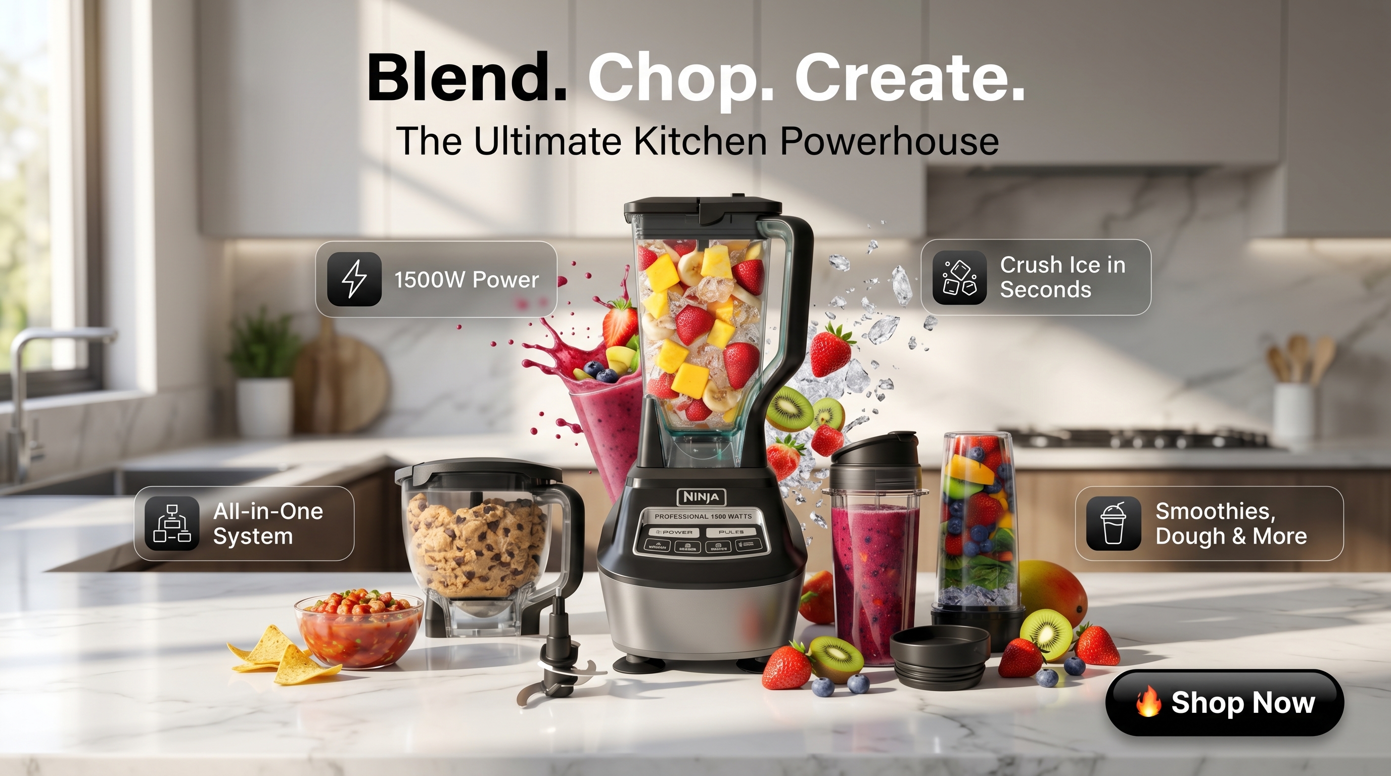 Blender + Processor + Cups — one powerful ninja kitchen system does it all.